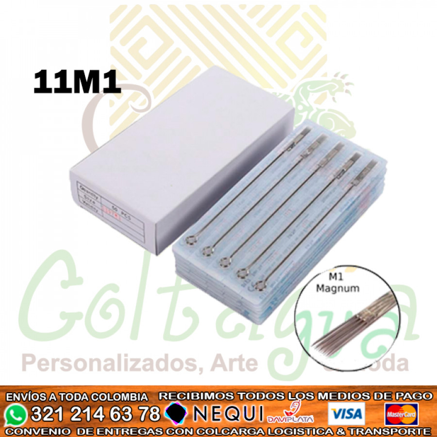La aguja para tatuar 11M1 es una aguja tipo magnum simple (M1) compuesta por 11 puntas dispuestas en una formación plana y ligeramente curvada. Está diseñada para cubrir áreas grandes de manera eficiente, facilitando un sombreado y relleno suave y uniforme.